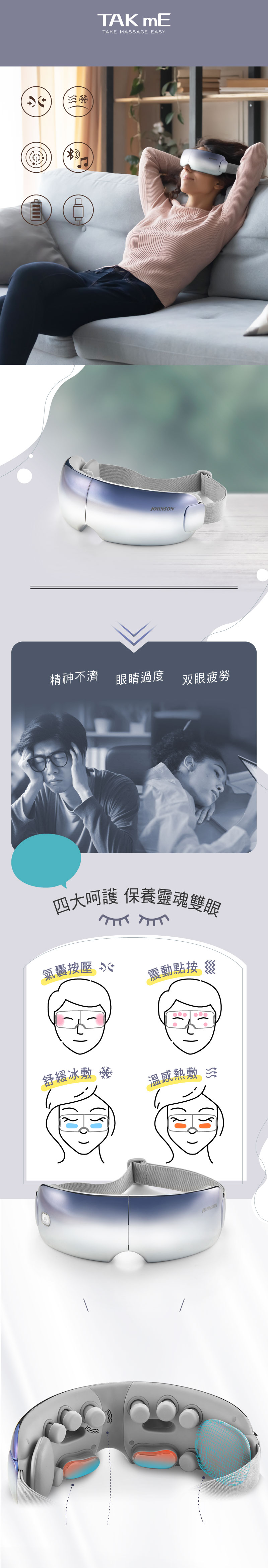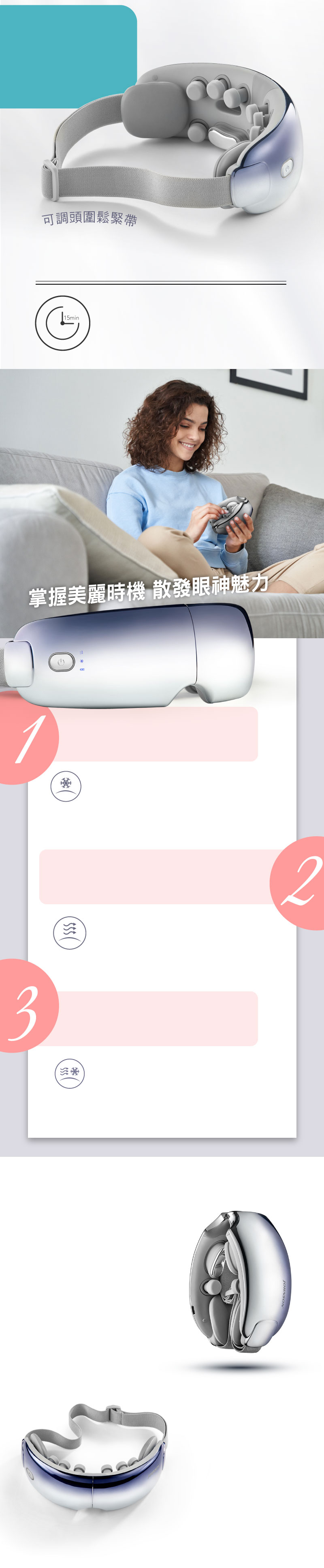 - 眼部呵護專家,眼周穴位多點震動搭配左右氣囊按壓、冰敷溫敷鎮定肌膚,讓你每天眼神魅力加分!