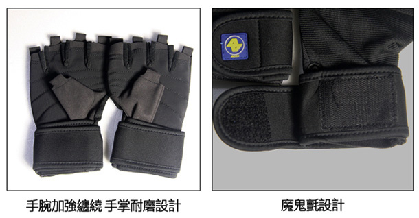 強韌材質不易磨損、手腕加強纏繞設計、各指末端貼心拉片
