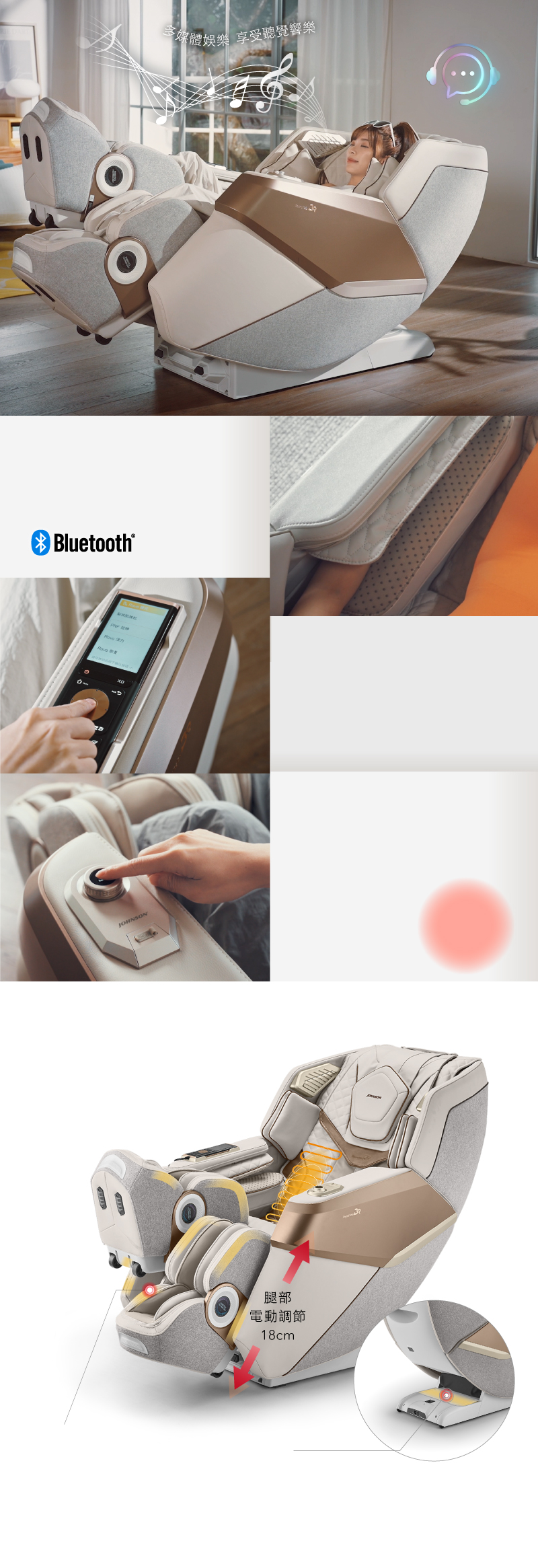 .藍牙連線喇叭、手臂磁性指壓墊、4吋全彩手控器、USB充電、扶手快捷鈕