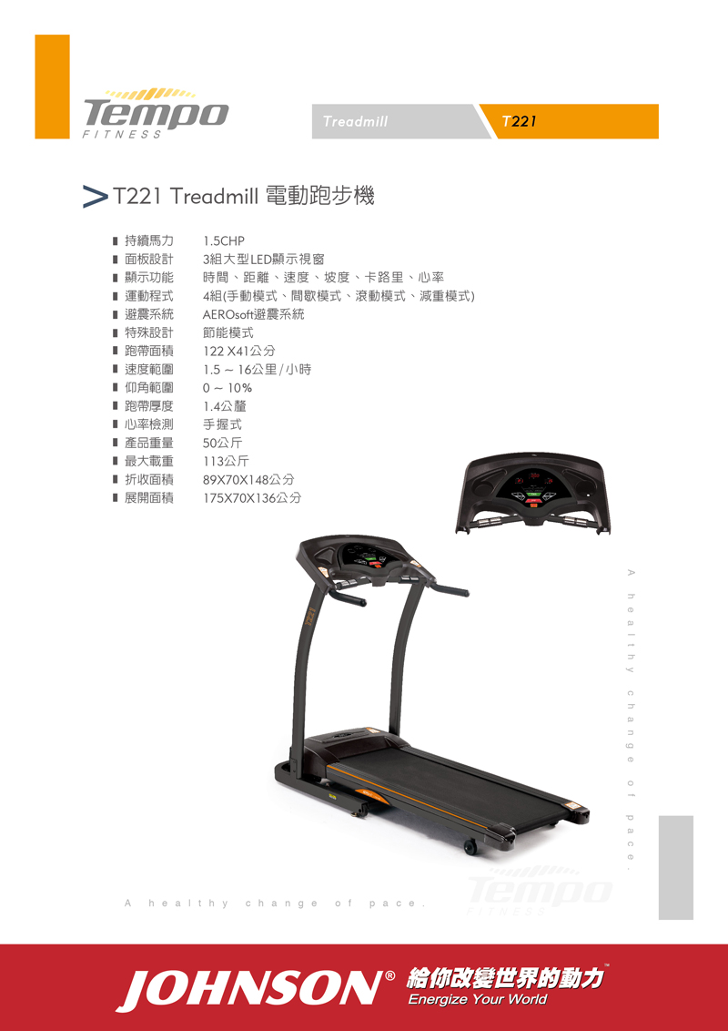 Johnson 建議,家用跑步機適當的持續馬力需在1.5馬力以上,如果你的家人中有體重超過80公斤,則建議選購2.0持續馬力以上的跑步機。註:部分廠商特別標榜的峰值馬力(最高馬力)指的是瞬間達到的最大承載值(數值約持續馬力1.5~2倍),但不具持續性。因此,馬達性能和持續馬力(Continuous)才是選購要件!